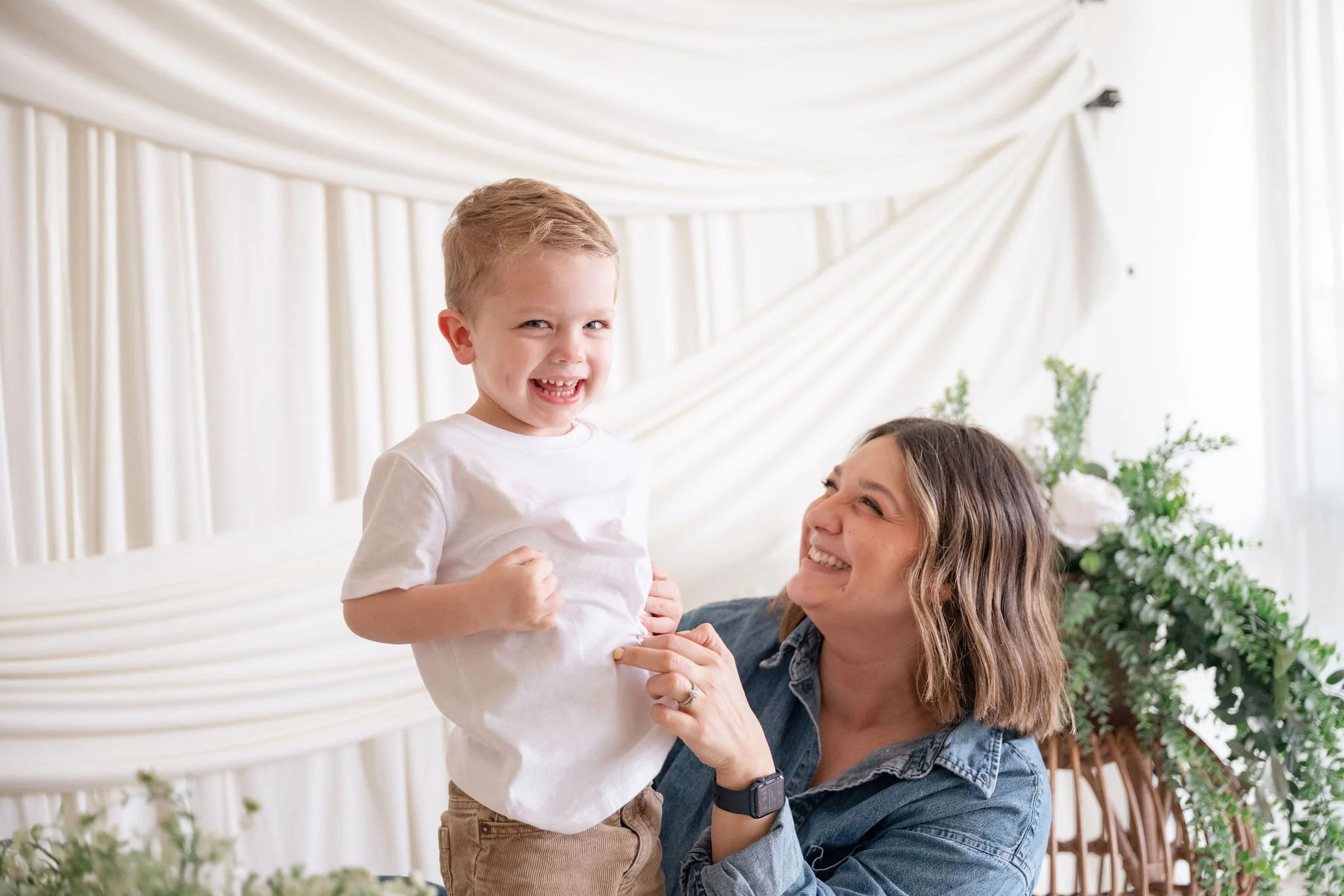 A gorgeous white drape backdrop with florals, perfect for mothers day photos. (Photos coming soon)